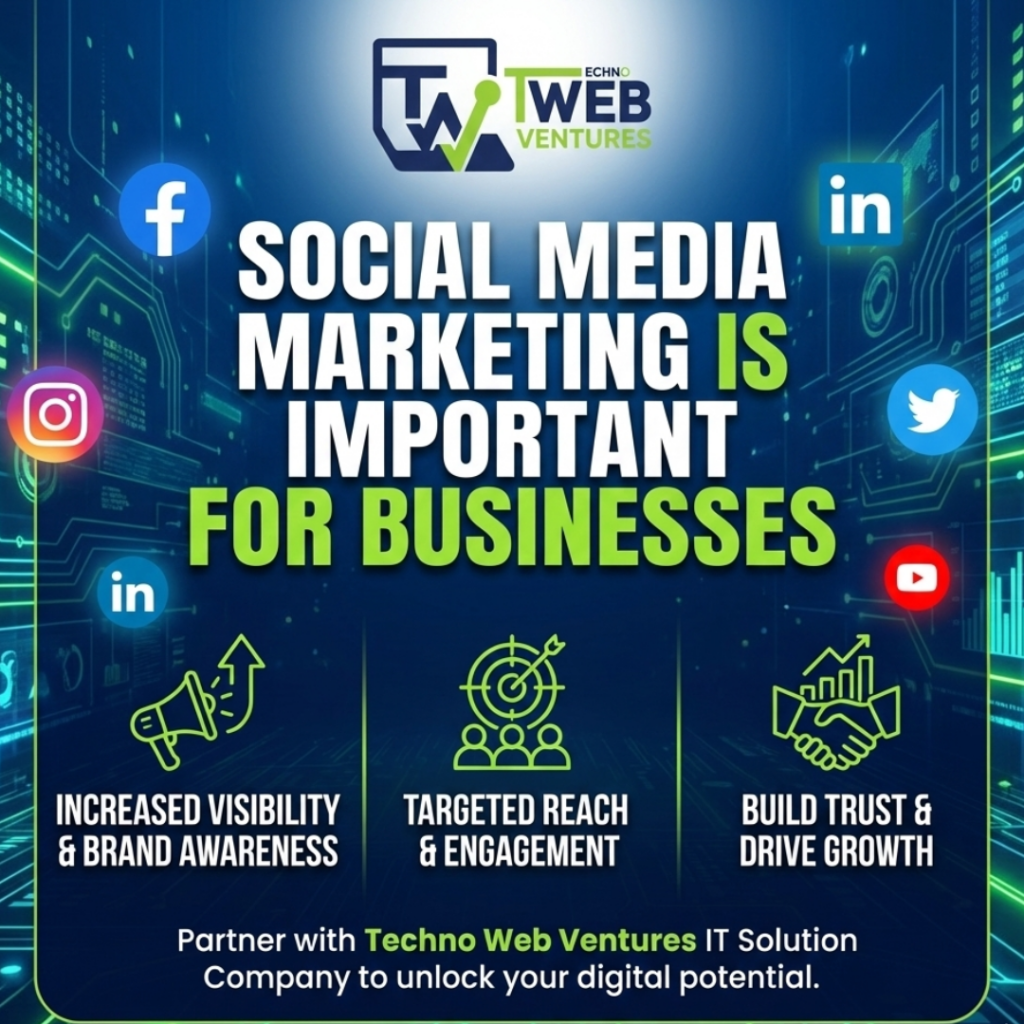 Why Social Media Marketing Is Important for Businesses Social media marketing is indeed one of the most powerful tools to enhance the growth of a new-age business. Understanding its significance enables companies to leverage online tools and platforms to increase brand awareness and sales.Today’s digital age has witnessed a paradigm shift in the way businesses interact with their clients. Conventional marketing methods find it difficult to grasp the attention and maintain their growth. This is when social media marketing becomes a critical tool for businesses. Social media sites like Facebook, Instagram, and LinkedIn have proven to act as major drivers for building brand and revenue generation.At Techno Web Ventures IT Solution, we assist firms in comprehending, executing, and benefiting from the successful application of a good social media marketing strategy. The Growing Power of Social Media The growing power of social media marketing for businesses lies in their ability to directly connect a brand with its target audience through means such as Facebook and Instagram marketing.Social media is no longer a source of entertainment or a platform for personal connectivity; it has transformed into an extended business ecosystem where customers discover brands, compare products, and read reviews on particular products for buying decisions. Millions of users spend hours every day scrolling through the feed on social media, making it one of the most influential platforms for marketing.It means one thing to the businesses: your customers are already on social media. If your brand is not present or active on it, then you risk losing the visibility, trust, and potential sales to competitors. 1. Builds Strong Brand Awareness At the forefront of the list of benefits that social media marketing provides for business is increased brand awareness and online visibility.Some of the biggest advantages of social media marketing center around brand visibility. If content and an advertising strategy are appropriately performed, your business could reach a large and more targeted audience. Consistent posting, engaging visuals, and creative storytelling help your brand stay top-of-mind among customers.Social media enables every company to express their values, personality, and special offerings that may differentiate them from the crowd. 2. Helps Reach the Right Audience Using advanced targeting options, social media advertising can help the business reach the right audience at the right time.Unlike traditional advertising, social media marketing allows one to precisely target people. Businesses can target users based on age, location, interests, behavior, profession, and more.At Techno Web Ventures IT Solution, we focus on data-driven targeting to make sure your marketing efforts reach people who are genuinely interested in your products or services, ensuring greater engagement and better conversions. 3. Cost-Effective Marketing Solution These services, such as social media marketing, are cost-effective solutions for startups and growing businesses.Social media marketing is among the most cost-effective digital marketing methods. Since it requires only a very low budget to get started, one can scale their campaigns with regard to performance. Compared to print, TV, or outdoor advertising, social media offers better reach, flexibility, and measurable returns.As a result, social media marketing is ideal for startups, small businesses, and growing enterprises. 4. Boosts Customer Engagement and Trust Businesses build trust and long-term brand loyalty through good online marketing engagement.Social media directly connects businesses with customers, whereby through likes, comments, sharing, and messages, the brand communicates in real time with the audience.Regular contact builds trust and strengthens relationships while building brand loyalty. When customers feel that they are being listened to and their feedback appreciated, they will more often go for a particular brand over its immediate competitors. 5. Drives Quality Leads and Sales Among the major reasons to invest in professional marketing techniques, lead generation through social media is one.The visibility that comes with social media marketing is but one aspect; it contributes directly to lead generation and an increase in sales. Accordingly, well-structured ad campaigns will be able to guide users from awareness to action.From website visits to inquiry forms, and all the way to direct purchases, each of these social media platforms supports every stage of the customer journey. 6. Improves Customer Insights and Analytics One of the big strengths of social media marketing is the data. Metrics of performance can be tracked that involve things like reach, engagement, clicks, conversions, and return on investment. These help the brand understand consumer behavior, preferences, and pain points, and drive continuous improvement in marketing strategies. 7. Supports Business Growth in Competitive Markets Social media marketing provides a competitive edge to the businesses in highly competitive industries. The brands that actively engage, advertise, and keep up with the trends earn more visibility and credibility.Creative content and targeted campaigns can make even a small business compete with larger brands. How Techno Web Ventures IT Solution Helps Businesses Succeed Techno Web Ventures IT Solution, one of the most trusted IT solution companies and a digital marketing partner, brings results-oriented strategies to grow businesses via social media. At Techno Web Ventures IT Solution, we believe that successful social media marketing is a mix of creativity, strategy, and performance analysis. We provide services: Social media strategy planning Content creation and ad design Facebook & Instagram ads Targeting of audiences and retargeting Tracking performance and optimization Our mission is to show businesses how to realize actual growth, not just likes and fol